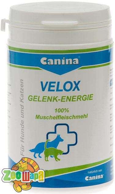 VELOX GELENK-ENERGIE (150 г) – є комплексним хондропротектором, який допоможе попередити хвороби суглобів у котів та собак. Позитивно впливає на структуру сполучної тканини, зв'язок, суглобового хряща, а саме: - зміцнює їх, сприяє регенерації, підвищують амортизаційні властивості, зменшує запалення (при наявності). Є актуальним для котів та собак будь якого віку. У кошенят та цуценят оптимізує розвиток суглобів та зв'язок, у вагітних – знижує навантаження на сполучну тканину. Покращує якість життя та активності у літніх тварин. Препарат виготовлено німецьким брендом Canina із молюска Perna canaliculus. Застосування: Препарат давати курсом від 4 тижнів і довше, залежно від потреб.Собакам: половину чайної ложки на 10 кг маси тіла змішати з кормом, максимум 2 чайних ложки у день.Котам: половину чайної ложки змішати з кормом. Для кошенят доза повинна бути зменшена.Одна чайна ложка відповідає приблизно 3 г.
