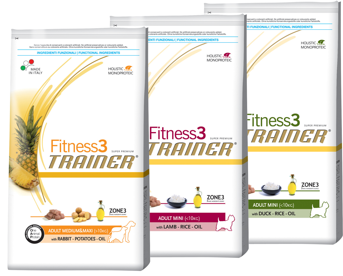 Ассортимент сухих кормов Trainer Fitness 3 представлен продукцией, предназначенной для кормления собак различных пород и возрастов. Так, для кормления щенков и юниоров в данных сухих кормах используется сочетание сублимированного мяса утки, риса и кукурузного масла. Для кормления взрослых особей торговая марка Trainer предлагает на выбор три основных сочетания: