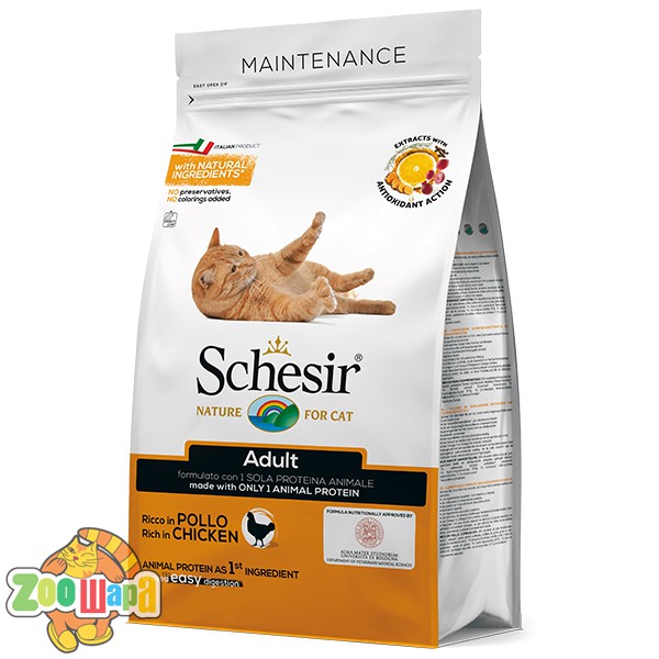 Schesir для взрослых котов с курицей- это полноценный сбалансированный корм в котором используются только натуральные составляющие, витамины и минералы которые должны быть в рационе Вашего питомца. Такой вид корма является монопротеиновым из-за того, что он содержит больше количество мяса курицы и не имеет других белков животного происхождения.