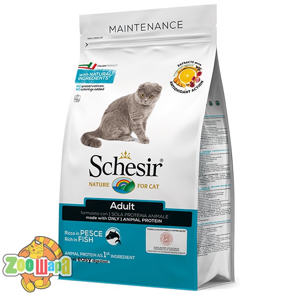 Schesir для взрослых котов с рыбой- это полноценный сбалансированный корм в котором используются только натуральные составляющие, витамины и минералы которые должны быть в рационе Вашего питомца. Такой вид корма является монопротеиновым из-за того, что он содержит больше количество мяса рыбы и не имеет других белков животного происхождения.
