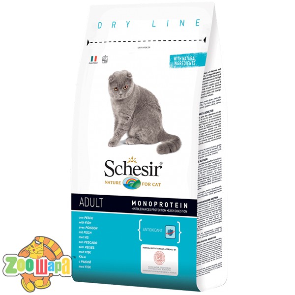 Schesir для взрослых котов с рыбой- это полноценный сбалансированный корм в котором используются только натуральные составляющие, витамины и минералы которые должны быть в рационе Вашего питомца. Такой вид корма является монопротеиновым из-за того, что он содержит больше количество мяса рыбы и не имеет других белков животного происхождения.
