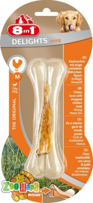 Делайтс Cтpoнг Кістка M - пресоване натуральне куряче м'ясо в оболонці із надміцної ялової шкіри, чудово доповнює щоденний раціон собаки поживними речовинами і мінералами. Головним завданням цих ласощів є очищення і дезінфекція ротової порожнини тварини після прийому їжі. Жувальні кістки задовольняють природну потребу собаки гризти кістки заради очищення зубів від зубного нальоту і профілактики карієсу. Нежирне дієтичні пресоване м'ясо надовго займає увагу, з’їдається повністю без залишків. Ці смачні корисні ласощі стануть винагородою улюбленця п ід час тренування.