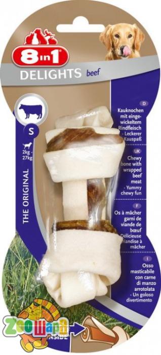 Ялова жувальна кістка «Делайтс Біф Кістка S» призначена для профілактики стоматологічних проблем у собак. Вона складається з високоякісного натурального нежирного ялового м’яса без додавання синтетичних домішок. Загорнуте у надміцну ялову шкірку, пресоване м'ясо довго жується і з’їдається повністю. Справжня натуральна яловичина у складі ласощів не викликає алергії і адаптована для собак харчовою чутливістю. Жувальні кістки з яловичини у додатку до щоденного раціону собак позбавляють їх від зубного нальоту, залишків їжі і очищають подих. Одночасно відбувається тренування шелеп тварини, масаж ясен і профілактика карієсу.
