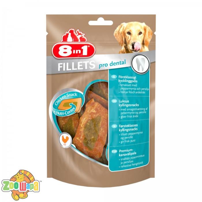 Ласощі для собак 8in1 Fillets Куряче філе 80 г (для зубів) чистять ротову порожнину від мікробів, сприяють укріпленню зубів і ясен, склад продукту наповнить організм вихованця силами, дозволяючи йому більше часу грати і тренуватися, що позитивно вплине на його самопочуття. Продукт не містить барвників, консервантів і ароматизаторів.