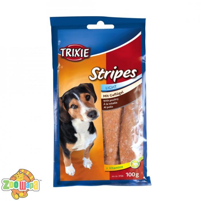 Ласощі для собак Trixie Stripes Light 100 г (курка) чистять ротову порожнину від мікробів, сприяють укріпленню зубів і ясен, склад продукту наповнить організм пса силами, дозволяючи йому більше часу грати і розважатись, що позитивно вплине на його настрій. Продукт не містить барвників, консервантів і ароматизаторів.