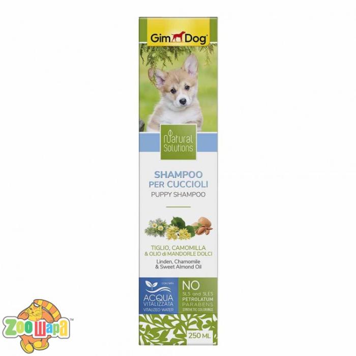 Для ефективного догляду за шерстю маленьких чотирилапих улюбленців, застосовується спеціальний шампунь Natural Solutions, для цуценят, 250 ml, GimDog, в складі якого містяться натуральні екстракти: липи (обмежує втрату води та захищає шерсть, зменшує її пористість, надає яскравості та м’якості. Флавоноїди та таніни, що містяться в липі, мають відновлювальні, тонізуючі та пом’якшуючі властивості), ромашки (захищає та пом’якшує шкіру, заспокоює свербіння, додає блиску світлій шерсті), олія солодкого мигдалю (має пом’якшуючі, протизапальні, антиоксидантні властивості, надає шерсті яскравого блиску, підходить для собак з чутливою шкірою). Шампунь делікатно очищує чутливу шкіру цуценят, забезпечує швидкий ріст шерсті, має легкий приємний аромат.