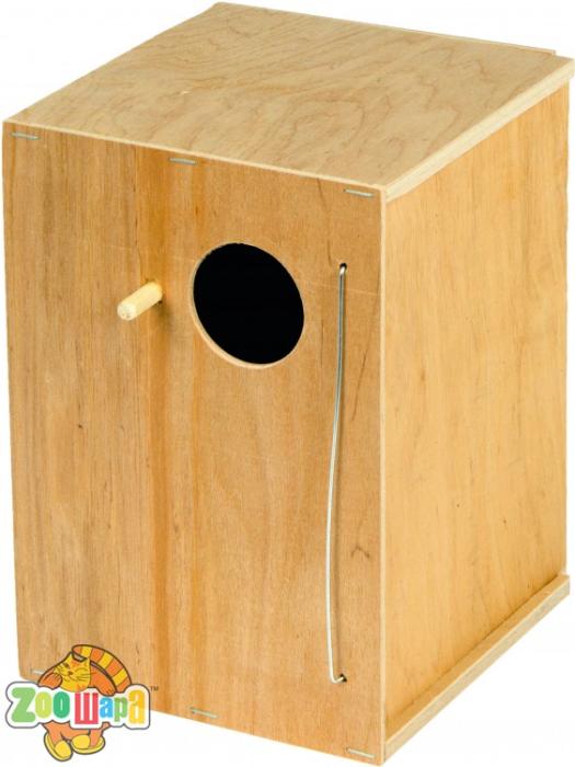 Будиночок для птахів виготовлений з фанери вищого сорту. Він надійно кріпиться із зовнішнього боку клітки, добре тримається і виглядає естетично. Матеріал не оброблявся токсичними речовинами - фарбами і лаками. Для комфорту пернатих улюбленців біля вічка прилаштована жердинка.