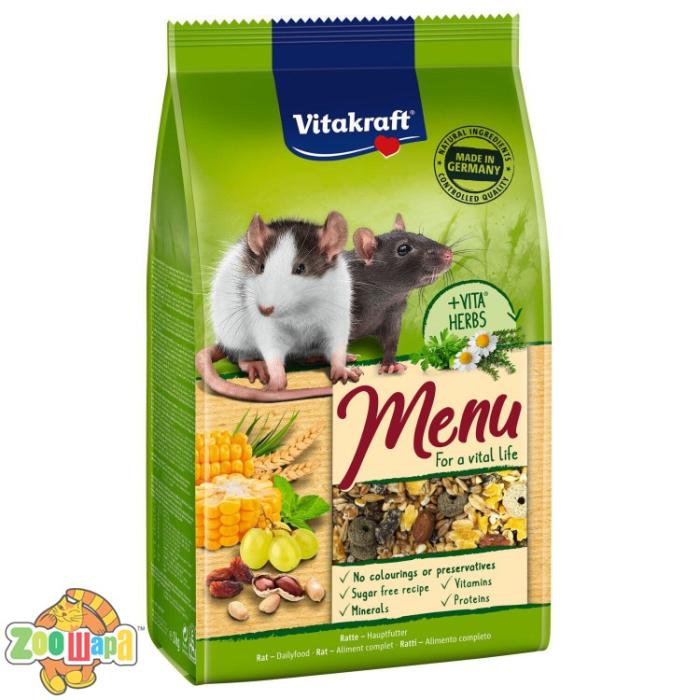Меню Vital - це збалансований раціон з цінним зерном, смачними фруктами та хрусткими горіхами для здорового всебічного харчування пацюків. Корм збагачений формулою Vita® Herbs - ретельно відібраною композицією цінних трав, таких як чебрець і м'ята, а також квітів гібіскуса і ромашки, які підтримують здоров'я. Білки забезпечують важливі амінокислоти і є оптимальним джерелом енергії для активних щурів. Спеціальна комбінація з натуральних інгредієнтів пов'язує неприємні запахи і зменшує їх утворення.