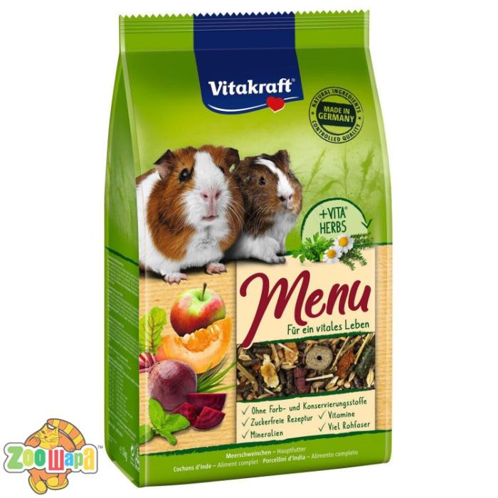 Меню Vital для морських свинок є збалансованим раціоном, в складі якого Ваш вихованець знайдете все необхідне для свого здорового і тривалого життя. Корм містить різні злаки, яблука, корисні овочі такі як гарбуз і буряк. Склад Menu не містить цукру. Всі необхідні Вітаміни, мінерали та мікроелементи сприяють відмінному стану Вашого гризуна.