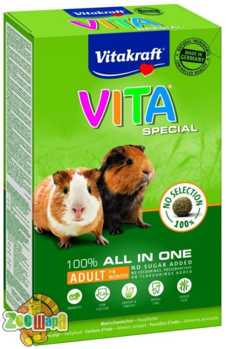 Корм д/мор. свинок VITA Special 600гр. – смачні та поживні ласощі для дорослих тварин, розроблені ветеринарами, з урахуванням особливостей домашніх улюбленців. Гранульований продукт задовольняє потреби навіть вибагливих тварин, містить в складі сиру клітковину, що покращує травлення, сприяє ефективному зточуванню зубів, а також: смачні трави (червону конюшину, подорожник, деревій), Омега – 3 та Омега – 6 жирні кислоти, пребіотик, вітаміни, мікроелементи (залізо, цинк, йод, інші). Також в кормі міститься спеціальний комплекс «Анти – запах», який складається з трьох компонентів натурального походження, зв’язує неприємні запахи, зменшує їх утворення.