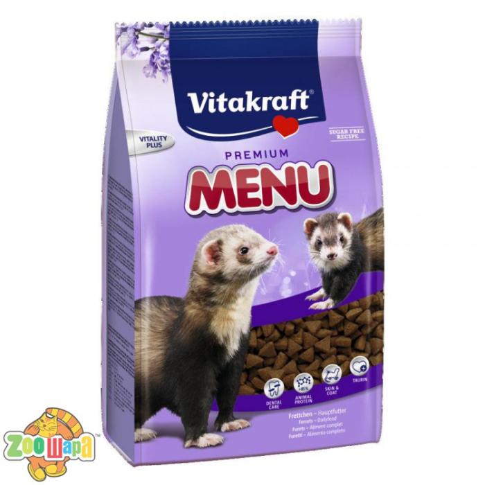 Корм д/тхорів Menu 800гр – це смачне та поживне меню, розроблене з урахуванням природних потреб тварин у харчуванні. Комплекс містить велику кількість білку тваринного походження (у вигляді м’яса), а також цінну речовину таурин, що покращує гостроту зору, нормалізує роботу серцево – судинної системи. Продукт збагачений біотином та цинком, що покращують стан шкіри та шерсті. Створений у вигляді хрумких шматочків, корм ефективно очищує зуби тхорів. Також у складі продукту містяться злаки, вітаміни, мікроелементи (залізо, йод, селен, інші), продукти рослинного походження, риба та рибні продукти.