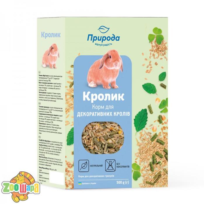 Рецептура корму «Кролик» розроблена на основі рекомендацій провідних фахівців з розведення кролів. Повноцінний вітамінізований корм для кроликів включає інгредієнти, необхідні для росту та розвитку молодих тварин і гарної кондиції дорослих. Крім зерна корм містить смакові добавки (сухі фрукти), вітаміни (А, В1, В2, D3 Е, Н), а також мінеральні речовини (солі кальцію, фосфору, калію, натрію). Застосування:годувати 2-3 рази на день невеликими порціями. Корм кожного разу насипати у чисту суху годівничку. Обов'язково в поїлці повинна бути свіжа вода.
