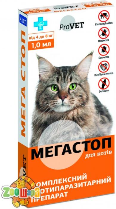 МЕГА СТОП имеет удобную форму выпуска SPOT-ON (капли на холку), а также удобную дозировку препарата, в зависимости от вида (коты и собаки) и веса животного. МЕГА СТОП назначают котам и собакам с профилактической и лечебной целью при поражении блохами, чесоточными клещами (Otodectes cynotis, Notoedres cati, Sarcoptes canis), демодекозными клещами, при кишечных нематодозах, а также в целях профилактики дирофиляриоза (эффективен против личинок L3 и L4 стадии).