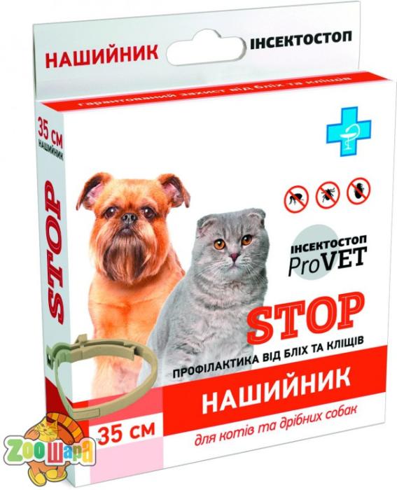 Інсектостоп нашийник для профілактики і лікування тварин при хворобах, викликаних ектопаразитами: блохами (Ctenocephalus canis), паразітіформнимі кліщами (Dermacentor pictus, Dermacentor marginatus, Rhipicephalus bursa, Ixodes ricinus), при сифункулятозах і малофагозах собак і котів. Опис: полімерна стрічка різного кольору, відповідно до використаного барвника, з фіксатором.