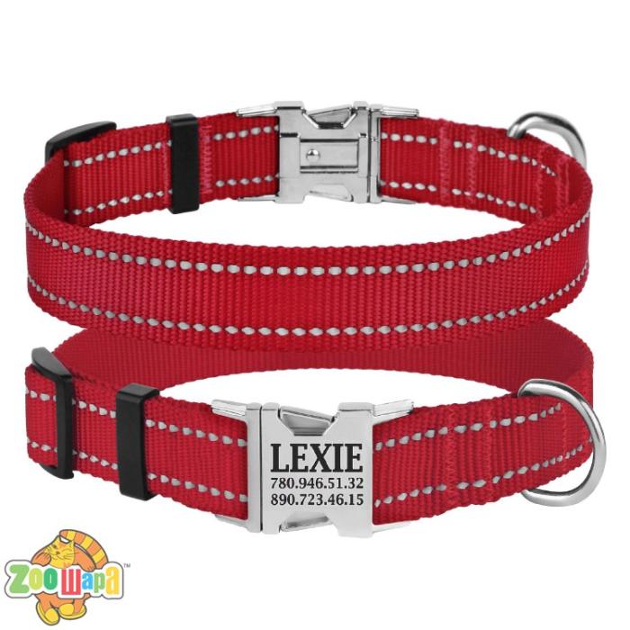 Ошейник выполнен с вплетением светоотражающей нити и укомплектован прочной металлической пряжкой с возможностью нанесения гравировки.
