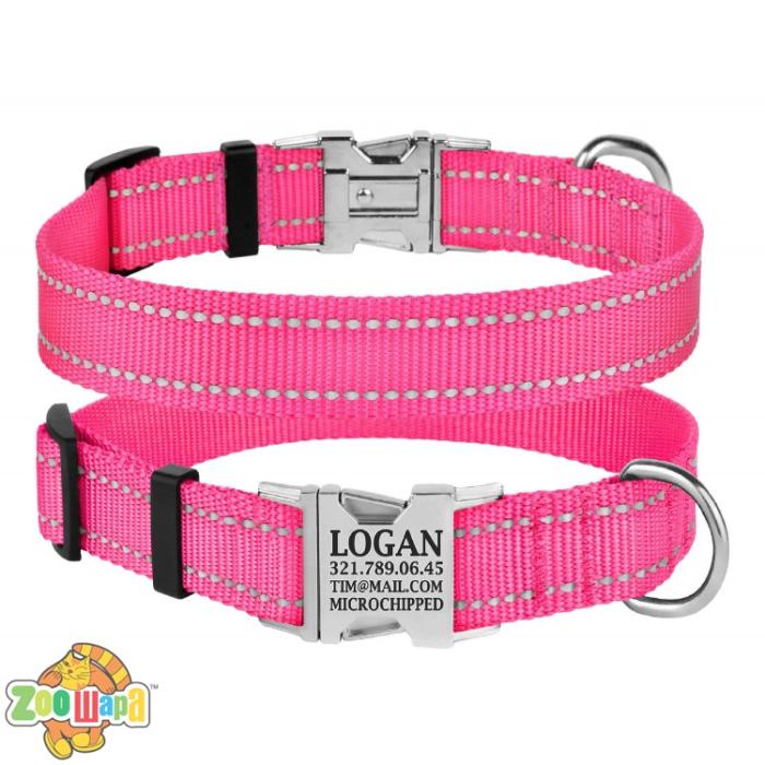 Ошейник выполнен с вплетением светоотражающей нити и укомплектован прочной металлической пряжкой с возможностью нанесения гравировки.