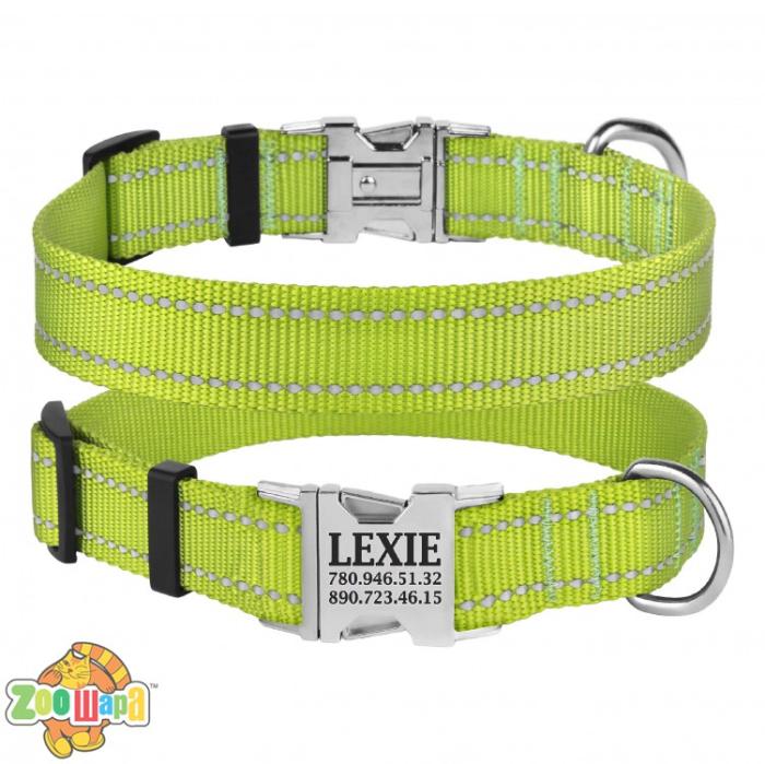 Ошейник выполнен с вплетением светоотражающей нити и укомплектован прочной металлической пряжкой с возможностью нанесения гравировки.