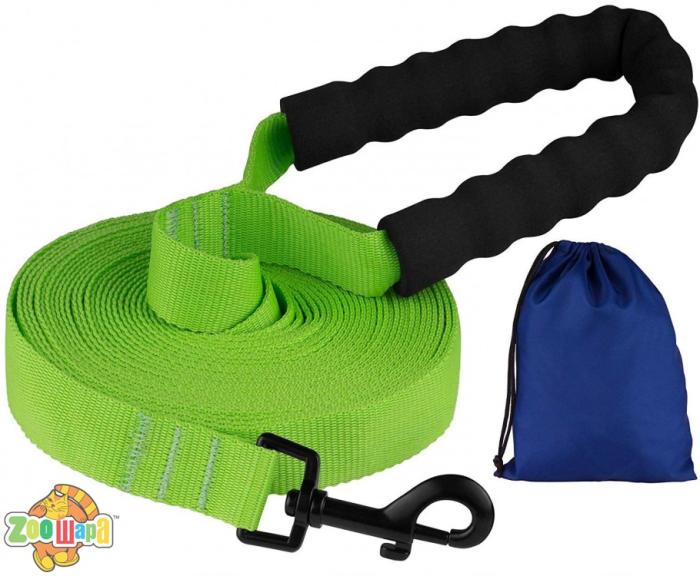 Этот поводок мягкий на ощупь, гибкий и не боится воды. Он практичен и неприхотлив в уходе.