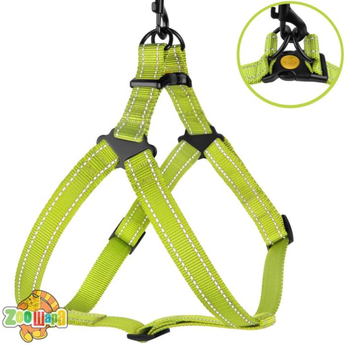 Шлея изготовлена с вплетением светоотражающей нити и укомплектована высококачественной пластиковой пряжкой. Обхват регулируется.