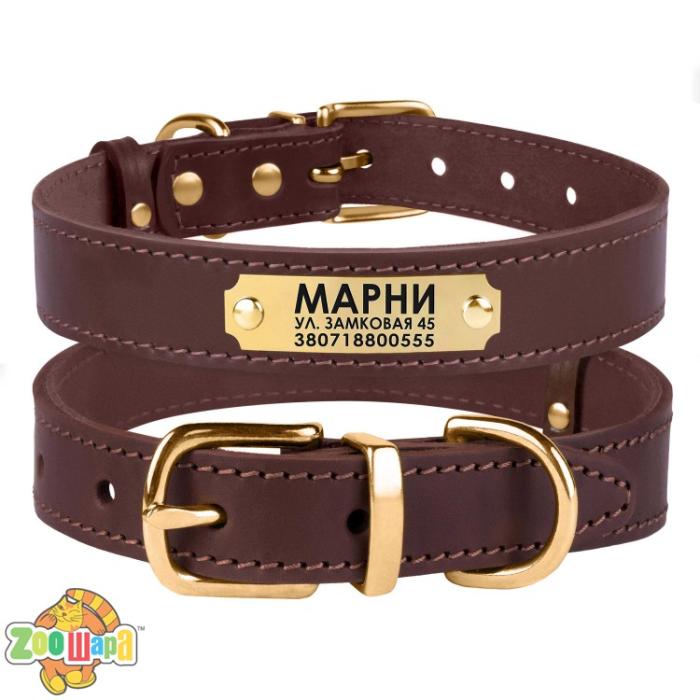 Этот ошейник может быть укомплектован адресником из латуни на заклепках с возможностью нанесения до 4 строк текста в зависимости от его размера.
