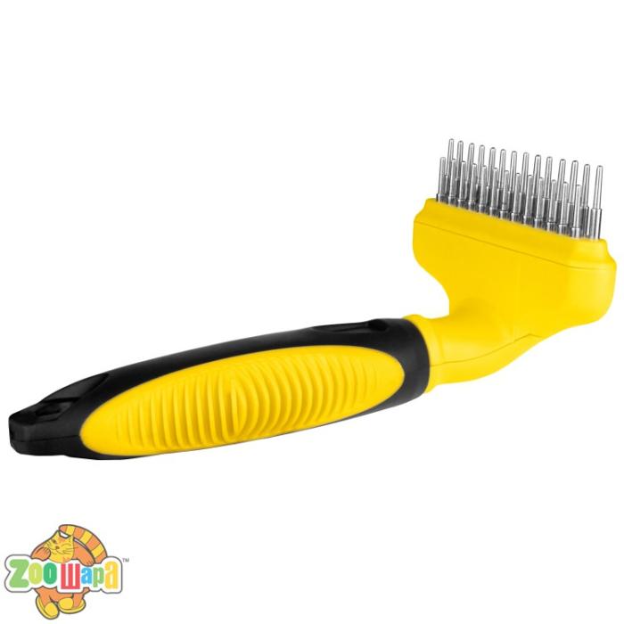 Двухрядная расческа грабли Bronzedog для аккуратного и интенсивного расчесывания шерсти и массажа кожных покровов собаки. Рабочая поверхность имеет два ряда вращающихся зубьев. Крутящаяся конструкция позволяет более нежно и аккуратно распутать длинную и среднюю шерсть, а также массажировать кожные покровы. Благодаря круглой конусообразной форме зубчиков волоски шерсти не выдергиваются и распутываются очень аккуратно, а закругленные кончики не повреждают кожу. Материал зубчиков - сталь высокого качества, не подвержена коррозии и не вызывает аллергических реакций. Пластиковая ручка с противоскользящим покрытием предотвращает скольжение. Регулярное использование расчески приводит шерсть и кожу в порядок, стимулирует приток крови к клеткам. Кожные покровы получают кислород и питательные вещества, оздоравливающе шерсть. Она блестит, имеет природный цвет, а структура волоса становится крепкой.