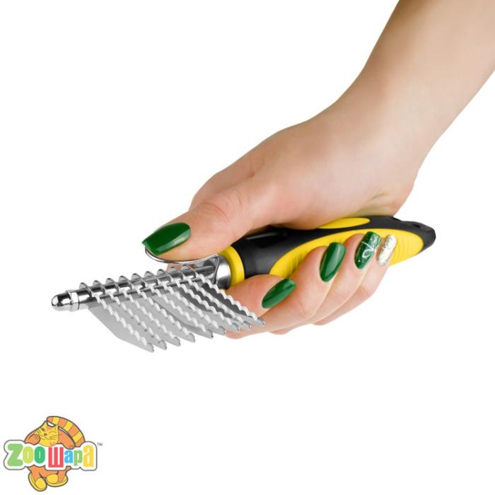 Колтунорез Bronzedog предназначен для абсолютно безболезненного удаления спутанных пучков шерсти животного. Лезвия произведены из нержавеющей стали. Пластиковая ручка с противоскользящим покрытием. Способствует устранению сбившихся участков шерсти, колтунов и запутанных комочков в местах, где другим инструментам обычно это не под силу. Эффективно справляется со своей задачей без вреда для основного шерстного покрова. Позволяет ухаживать за шерстью питомцем без необходимости контактировать с его кожей, для этого достаточно провести колтунорезом под наклоном и по направлению роста волос животного.