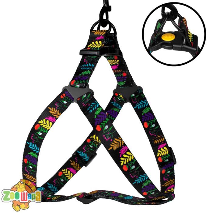 Высокопрочный нейлон, из которого изготовлена шлея, не теряет цвет при стирке и не выгорает на солнце.