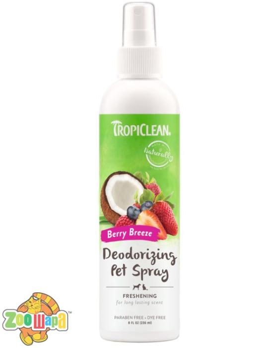 Дезодоруючий спрей "Свіжа ягода" для домашніх тварин освіжає, захищає та заспокоює шерсть та шкіру улюбленця. Засіб розщеплює джерело неприємного запаху, ефективно дезодоруючи вашого пухнастика між купаннями. Може використовуватись для свіжості спальних місць тварини та будинку в цілому.