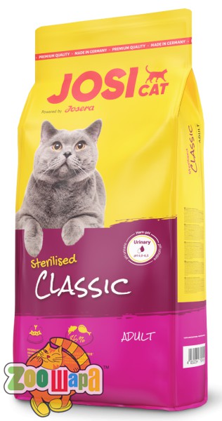 JosiCat Sterilised Classic вкусная еда для стерилизованных кошек. Сбалансированное содержание минералов способствуем уровню рН мочи 6,0-6,5, что предотвращает образование мочевых камней.
