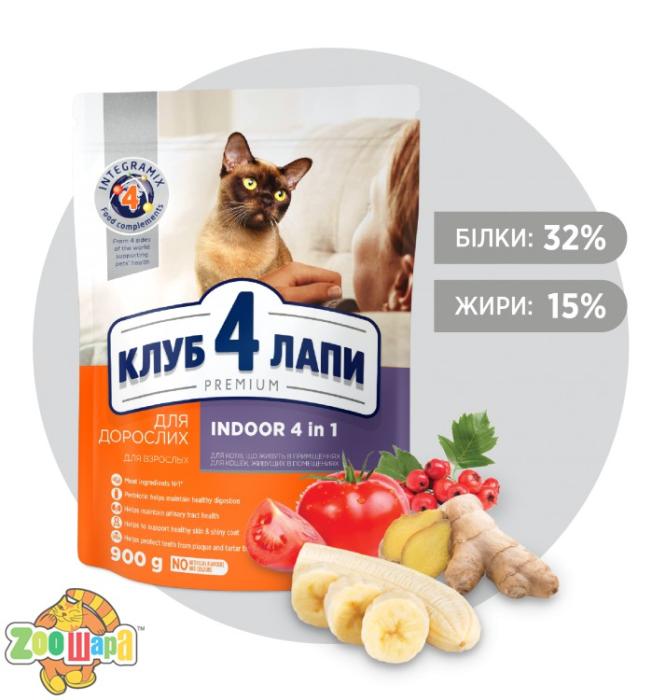 Сухой премиум-рацион содержит формулу «4 in 1» для взрослых кошек, живущих дома: