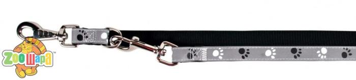 Надежная двухслойная перестежка для собак, выполненная из нейлона и пластика. Имеет 3 стадии регулировки. Размер - M-L. Длина - 2 м. Ширина - 20 мм. Цвет - черный с серебристо-серым (орнамент из отпечатков лап).