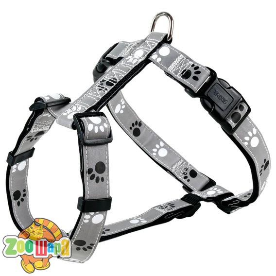 Надежная и прочная, светоотражающая, полностью регулируемая в области груди и живота шлея. Материал - пластик (верхняя сторона) и нейлон (нижняя сторона). Размер - S-M. Длина охвата - 40-65 см. Ширина ремня - 20 мм. Цвет - серый (с орнаментом из отпечатков лап).
