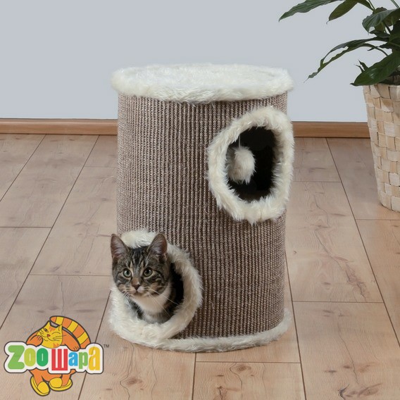 Модель когтеточки «башня», благодаря компактным размерам, не займет много место в квартире. Выполненная в спокойных тонах, она прекрасно впишется в интерьер любого стиля. Внутри башня обтянута плюшем, снаружи натуральным волокном.