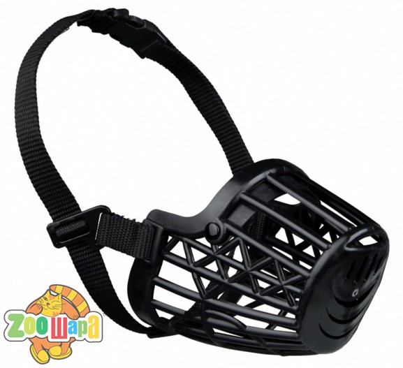 Пластиковый намордник для собак с крупной сеткой, гарантирующей безопасность и не нарушающей дыхательные процессы животного. Регулируемый нейлоновый ремешок. Цвет - черный. Размер M-L. Охват морды 26 см.