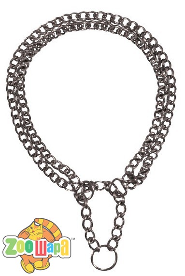Двойной хромированный ошейник-цепь, оснащенный системой мягкой остановки. Длина: 45 см. Толщина проволоки: 2,5 мм.