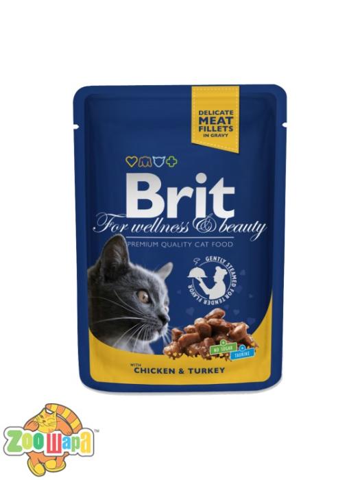 Brit Premium Cat pouch 100 g курица и индейка. Сбалансированный влажный корм премиум класса для взрослых кошек. В состав входит натуральное мясо курицы и индейки, вкус которого понравится самым привередливым питомцам. Приготовлен из продуктов высокого качества, хорошо усваивается. Не содержит красителей, консервантов, ароматизаторов. В приготовлении используют рецептуру, которая позволяет сохранить большое количество минералов и витаминов.