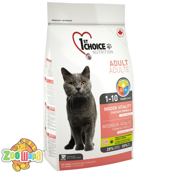 1st Choice Indoor Vitality Adult сухой супер премиум корм на основе куриного мяса – основной выбор для квартирных кошек в возрасте от 1 до 10 лет. Это одна из самых популярных формул, так как кошки обожают курятину. Сбалансированный состав корма помогает поддерживать здоровье и оптимальную кондицию взрослых домашних кошек всех пород.