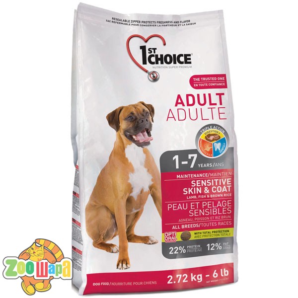 1st Choice Sensitive Skin & Coat Adult Lamb & Fish для взрослых собак - Супер премиум корм на основе мяса ягненка, океанической рыбы и коричневого риса для взрослых собак всех пород склонных к аллергии в возрасте от 1 до 7 лет. Ягненок и рыба - гипоаллергенные источники протеина - главные ингредиенты этой сбалансированной и очень вкусной формулы.
